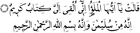 Во имя Аллаха Милостивого, Милосердного! "Она сказала: "О знать! Мне было брошено благородное письмо. Оно от Сулеймана (Соломона), и в нем сказано: "Во имя Аллаха, Милостивого, Милосердного!"» (Коран, 27:29-30)
