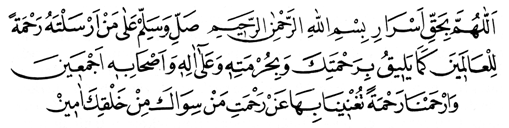 "О Аллах! Ради прав "Бисмиллахиррахманиррахим" благослови и одари миром того, кого Ты послал милостью для миров так, как приличествует Твоему Милосердию и Состраданию, а также его семью и сподвижников. И одари нас Своей милостью так, чтобы не осталось у нас нужды в сострадании кого-либо из Твоих созданий ".
