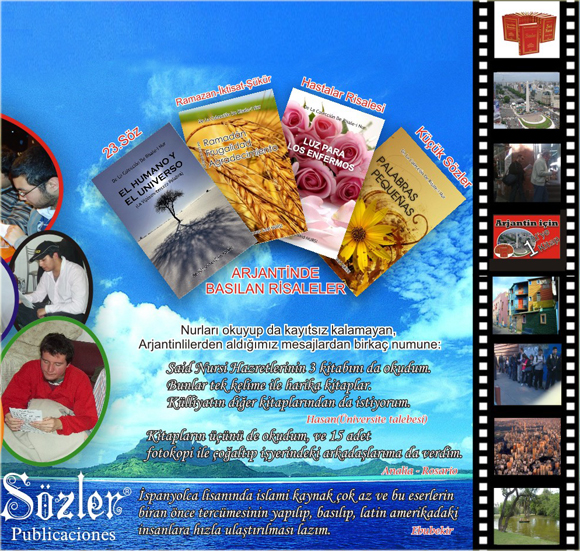 Yaklaşık 4 ay önce nur hizmetlerine ilk adımın atıldığı Arjantin'de, Cenab-ı Hakk'a şükürler olsun ki, 4 kitabın basımını gerçekleştirmek nasip oldu. En son olarak bin adet baskıya verdiğimiz, Ramazan, İktisat ve Şükür Risalelerini matbaadan teslim aldık. Aynı gün, teravih namazı için gittiğimiz El Ahmed camiinde, cemaate takdim ettik. Ertesi gün, cuma namazı sonrasında da hem daha önceden tanıştığımız, hem de yeni tanıştığımız kişilere verdik. Ayrıca camii yetkililerinden aldığımız izne binaen ramazan ayı boyunca cuma ve cumartesi günleri burada Sözler Neşriyat adına küçük bir stand açıp, nurları cemaate sunacağız. İnşallah bu şekilde doğrudan ve çok daha hızlı olarak kitaplarımızı arzu edenlere ulaştırmış olacağız.