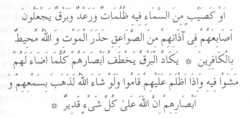 Or [the parable] of a violent cloudburst in the sky, with utter darkness, thunder and lightning: they put their fingers into their ears to keep out the peals of thunder, in terror of death; but Allâh encompasses [with His might] all who deny the truth. * The lightning well-nigh takes away their sight; whenever it gives them light, they advance therein, and whenever darkness falls around them, they stand still. And if Allâh so willed, He could indeed take away their hearing and sight: for verily Allâh is powerful over all things. (Aw ka-sayyibin min al-samâ' fîhi zulumâtun wa ra'dun wa barqun yaj'alûna asabi'ahum fi âdhânihim min al-sawâ'iq hadhara al-mawt, wa Allâh muhîtun bi'l-kâfirîn. * Yakâdu al-barqu yakhtafu absârahum kullamâ adâ'a la-hum mashaw fihi wa idhâ azlama 'alayhim qâmû wa-law shâ'a Allâh la-dhahaba bi-sam'ihim wa absârihim, innâ Allâha 'alâ kûlli shay'in qadir.)