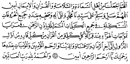 ¡Oh Allah! Escógenos de entre la gente feliz, segura, del Corán y la creencia. Amén. ¡Oh Allah! Concede paz y bendiciones a nuestro Maestro Muhammed y a su Familia y Compañeros, tanto las letras que componen sus palabras, representadas con el permiso del Más Misericordioso en los reflejos de las ondas del aire, en el recitar de cada una de las palabras por todos los que recitan el Corán desde su primera revelación hasta el final de los tiempos, y ten misericordia de nosotros y nuestros parientes, y ten misericordia de todos los hombres y mujeres creyentes tan numerosos como aquellas palabras. A través de Tu Misericordia, Oh el Más Misericordioso de la misericordia. Amén. Todas las alabanzas sean a Allah, el Señor de Todos los Mundos