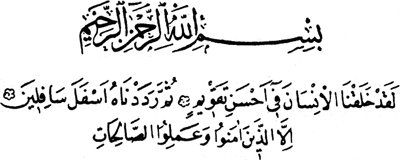 Olemme luoneet ihmisen sopusuhtaiseksi * mutta lopulta me palautamme hänet alhaiseksi * paitsi niitä, jotka uskovat ja tekevät hyviä töitä.