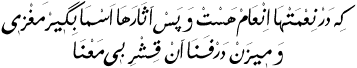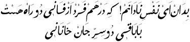 О мой невежественный нэфс\ Знай: хоть и этот мир и создания бренны, но во всех бренных вещах ты можешь найти два пути, ведущих в вечность. И ты можешь увидеть два сияния, две тайны от проявления Красоты и Милости Извечно Возлюбленного, являющихся душой и жизнью. Но с условием, если ты сможешь перейти от внешних преходящих образов и посмотреть на мир другими глазами.