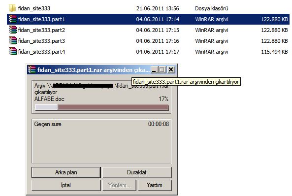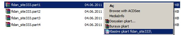 İndirmiş olduğunuz 4 adet rar dosyasından aşağıdaki resimde görünen mavi renkte işaretlenmiş olan Klasöre çıkart fidan_site333part1 .rar dosyasına tıklayınız.