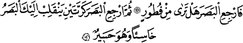 dalolati ila va shu ifodaga ko’ra inson nazari, qusurini topmoq uchun qanchalik urinmasin, hech qaerda qusur topolmay horg’in holda manzili bo’lmish ko’zga kelib, uni jo’natgan tanqidchi aqlga deydiki, "Behudaga charchadim, qusur yo’q". Bu bilan ko’rsatadiki, Nizom va intizom g’oyat mukammaldir. Demak, koinotdagi intizom -- Yagonalikning qat`iy shohididir.